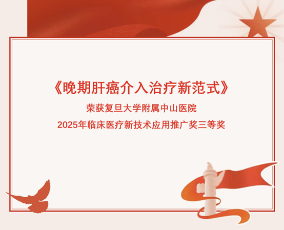 近日,复旦大学附属中山医院介入治疗科瞿旭东教授牵头完成的临床创新项目《晚期肝癌介入治疗新范式》荣获中山医院2025年临床医疗新技术应用推广奖三等奖。
