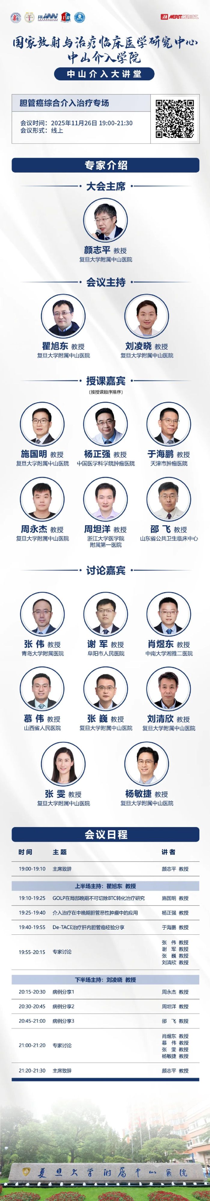 为了开拓胆管癌治疗的思路,引领规范化诊疗,由复旦大学附属中山医院、国家放射与治疗临床医学研究中心、上海市影像医学研究所、复旦大学附属中山医院介入科主办的「中山介入大讲堂」第62期-胆胰介入亚专科活动-胆管癌综合介入专场,将于2025年11月26日(周三)19:00在线举行!